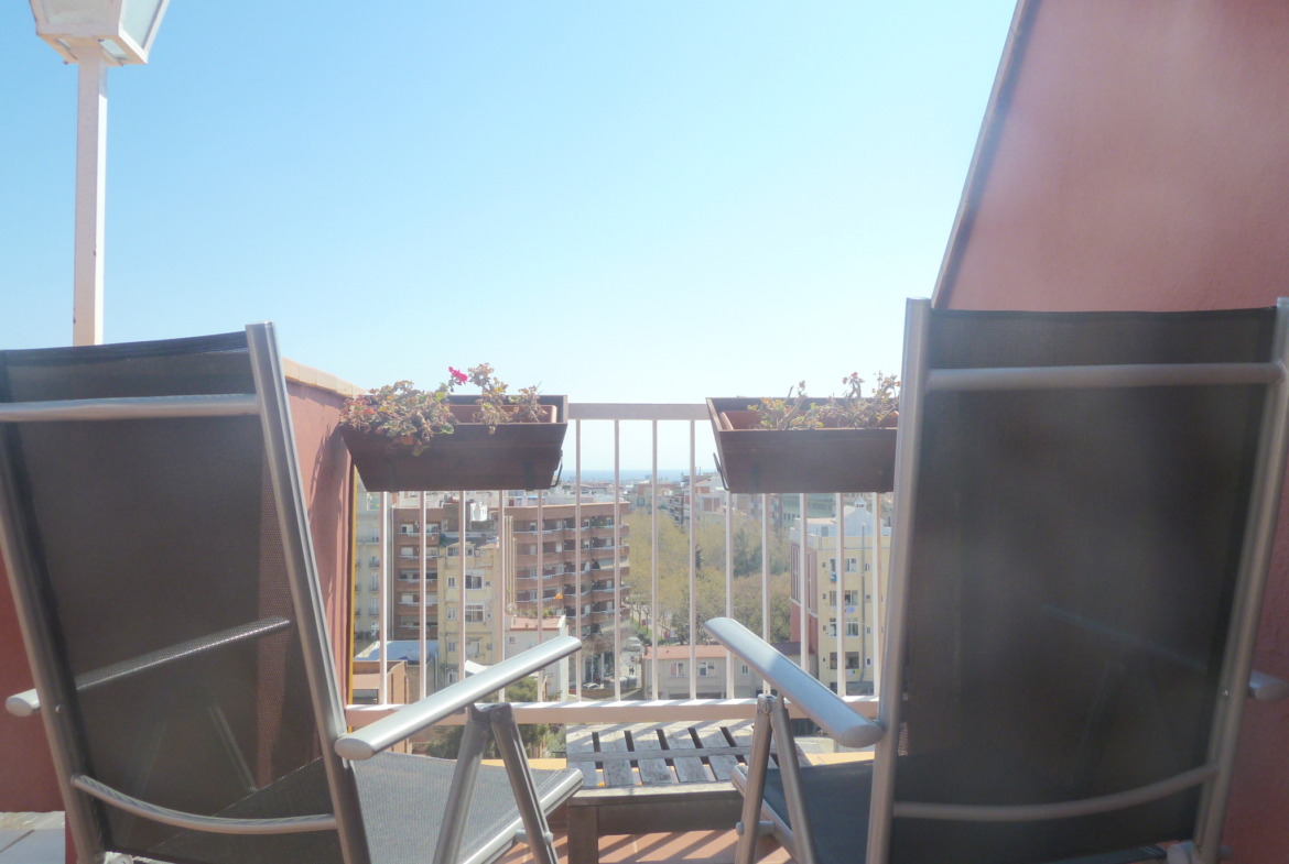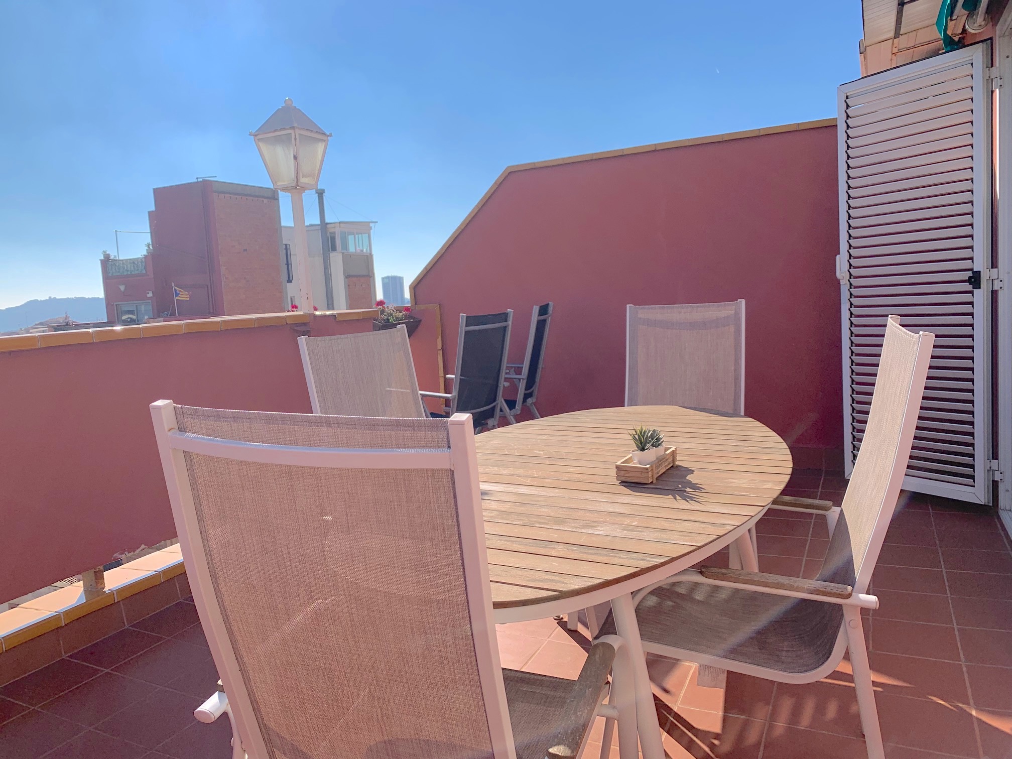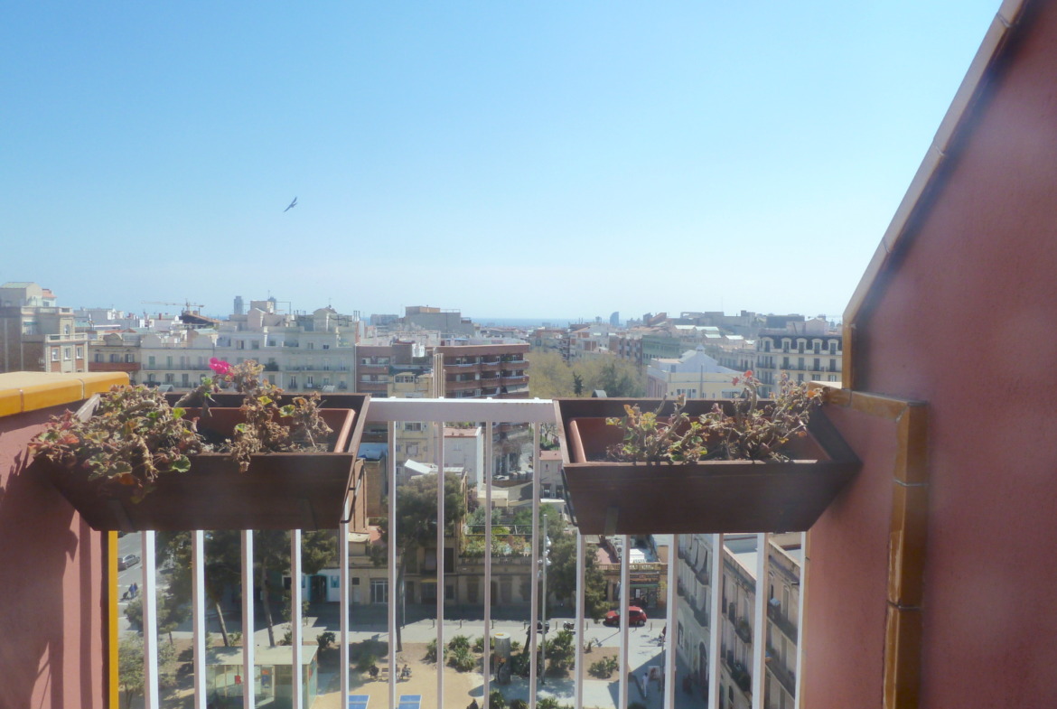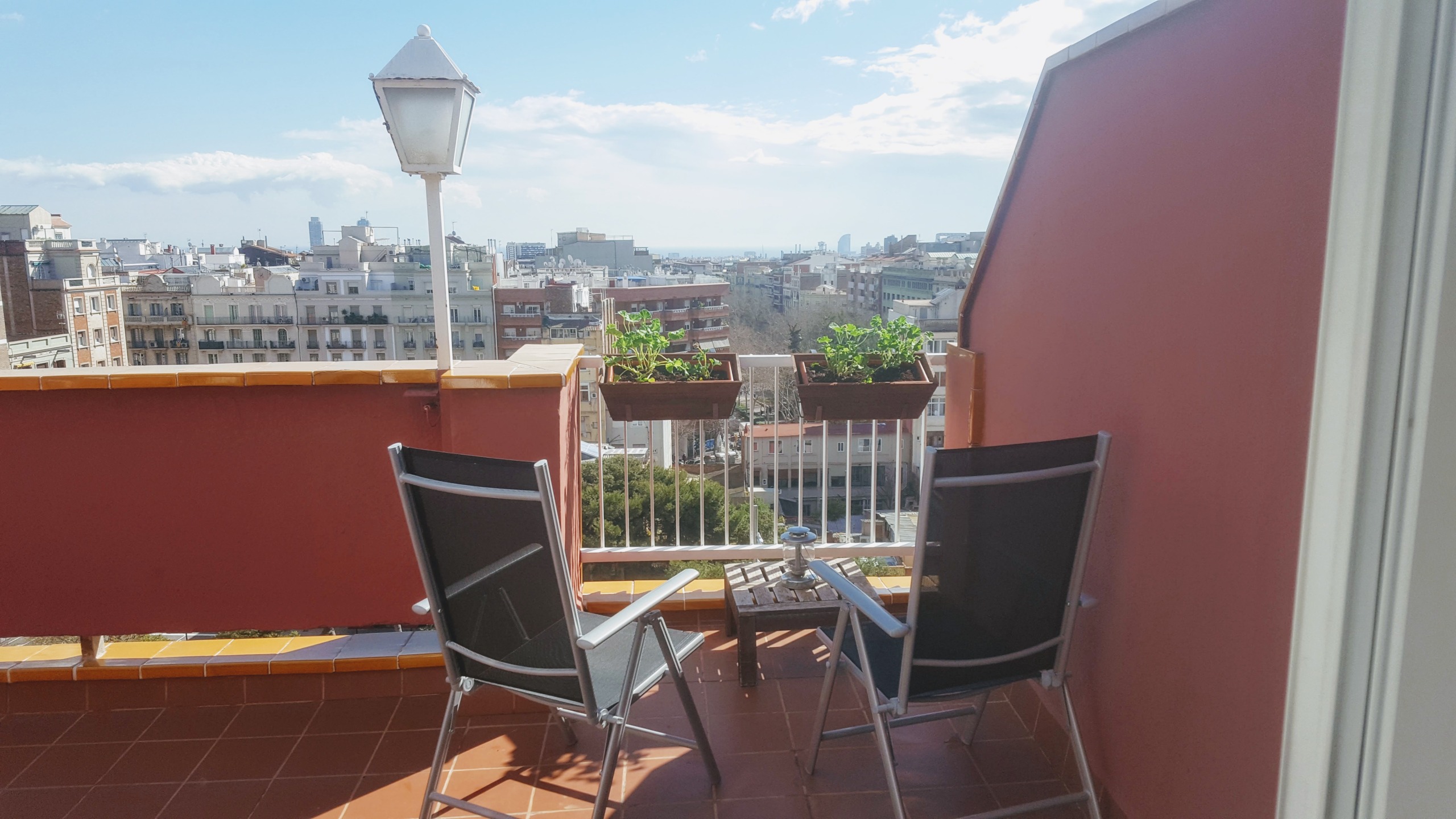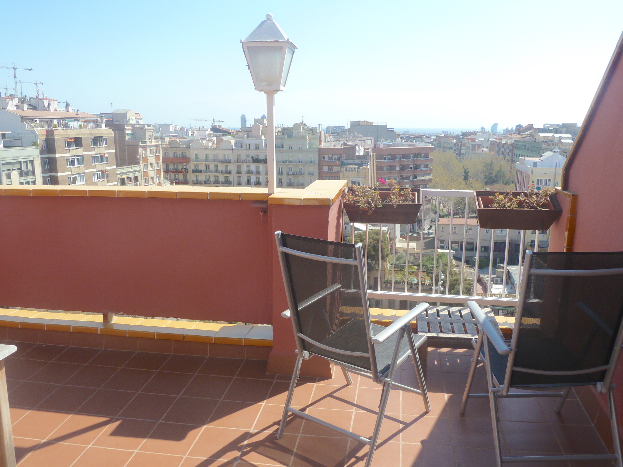 Modern-style penthouse with 2 bedrooms and a maximum of 4 people with a private, sunny terrace and spectacular views of Barcelona, all the way to the sea. Families welcome! Park for children in front… It has a double room with a double bed and another with 2 single beds.