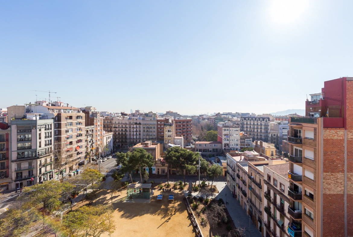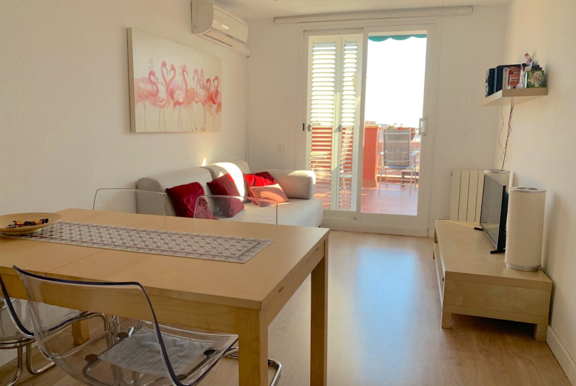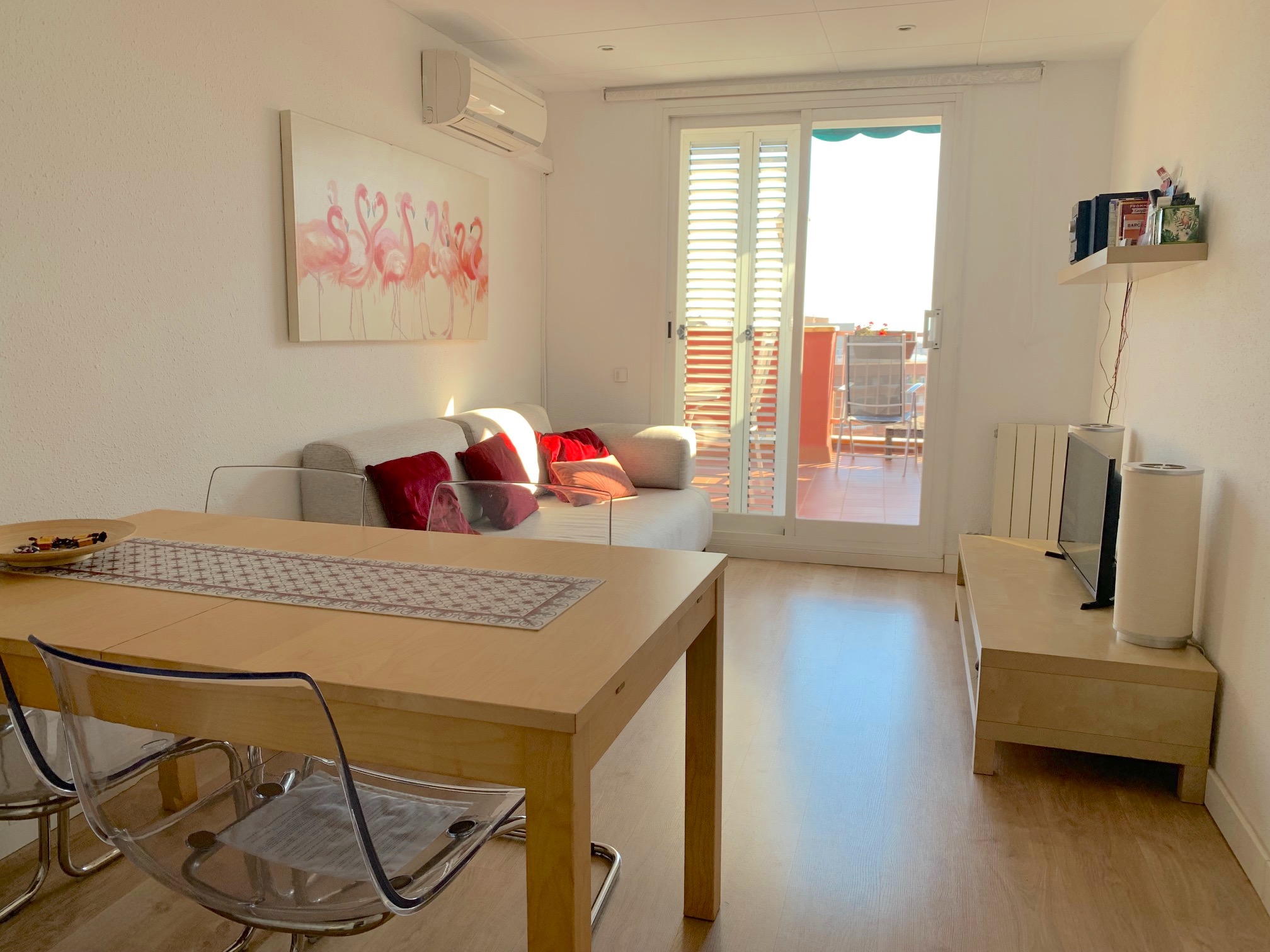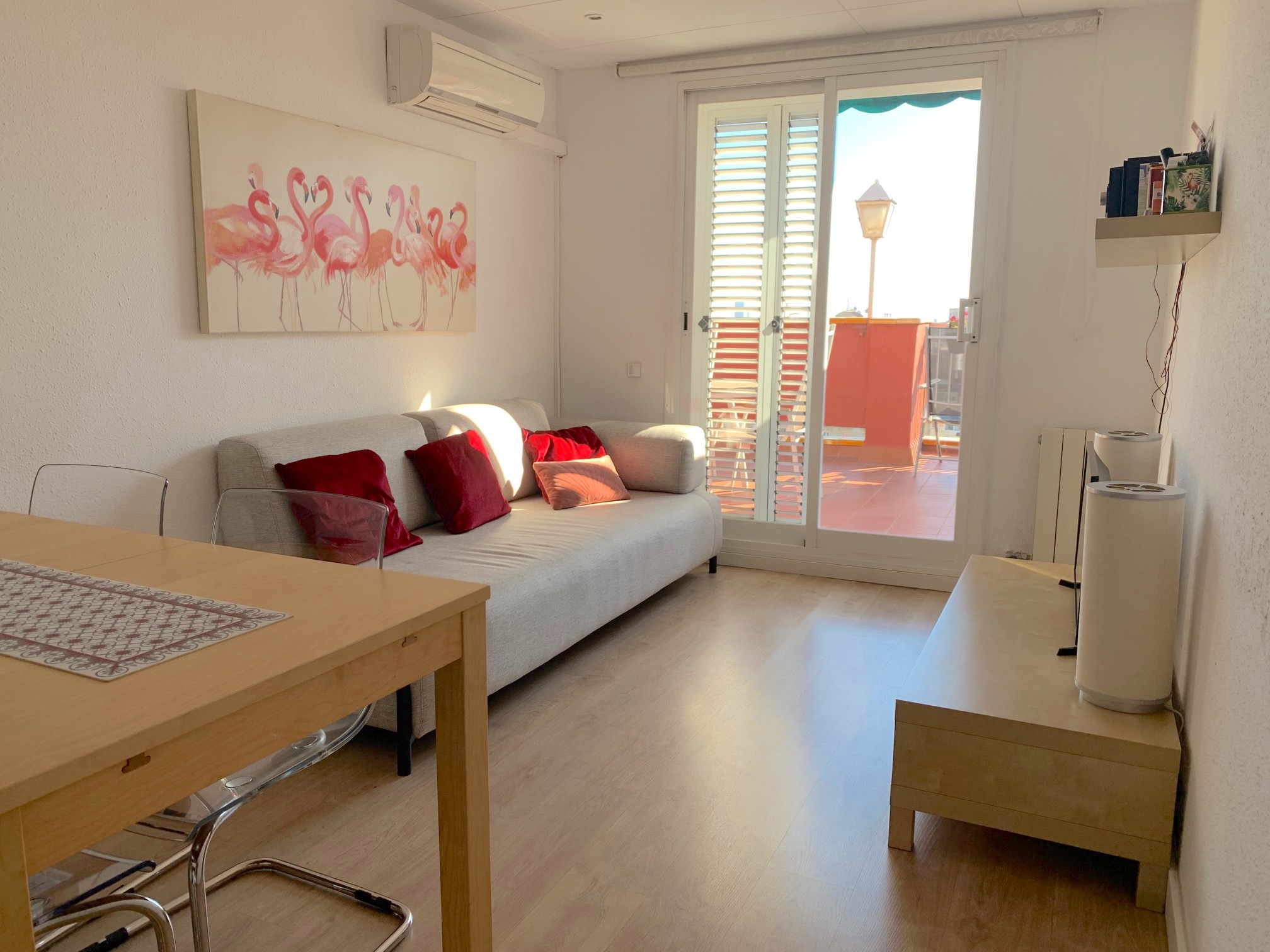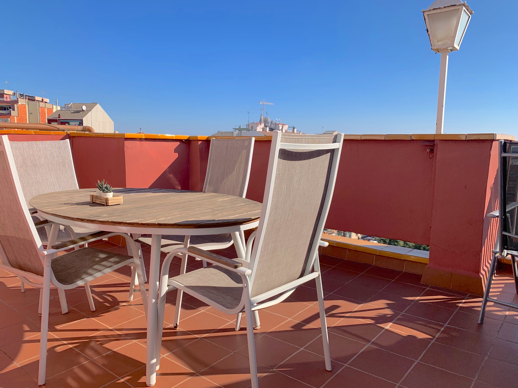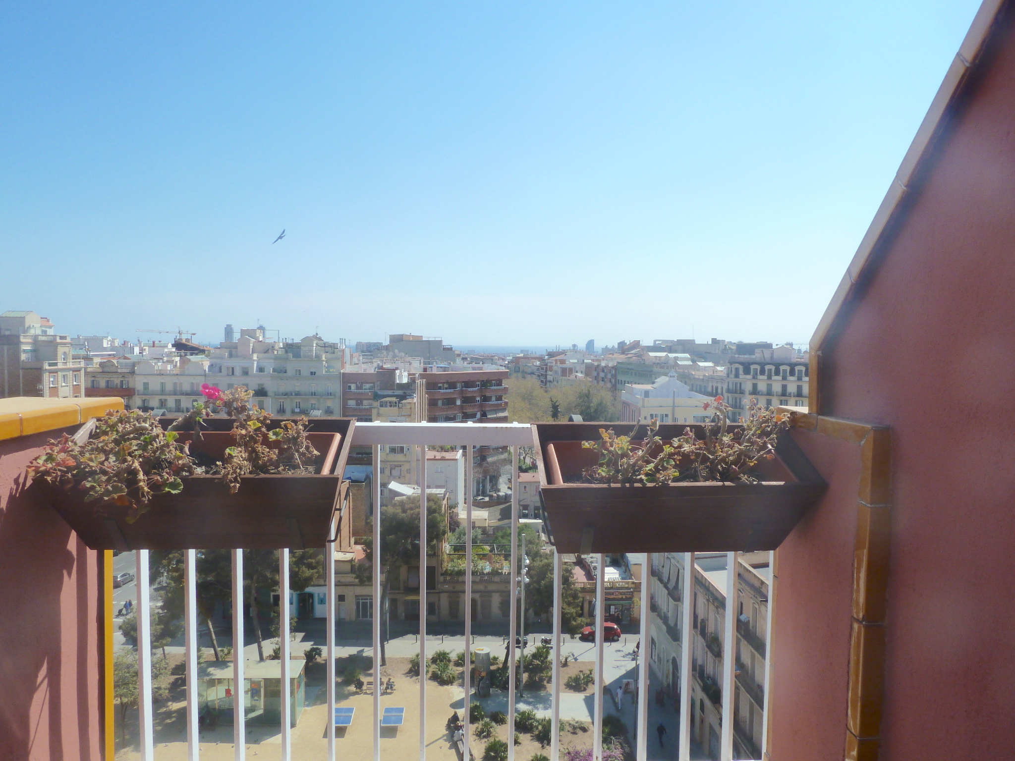 Modern-style penthouse with 2 bedrooms and a maximum of 4 people with a private, sunny terrace and spectacular views of Barcelona, all the way to the sea. Families welcome! Park for children in front… It has a double room with a double bed and another with 2 single beds.