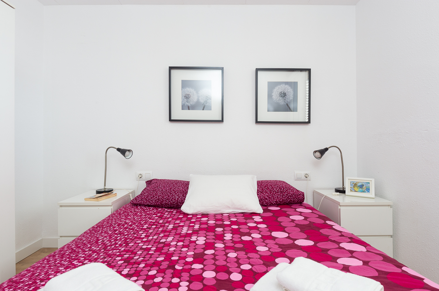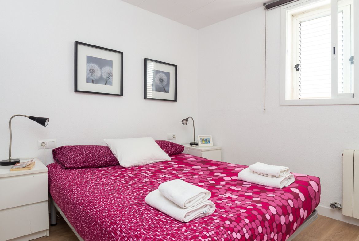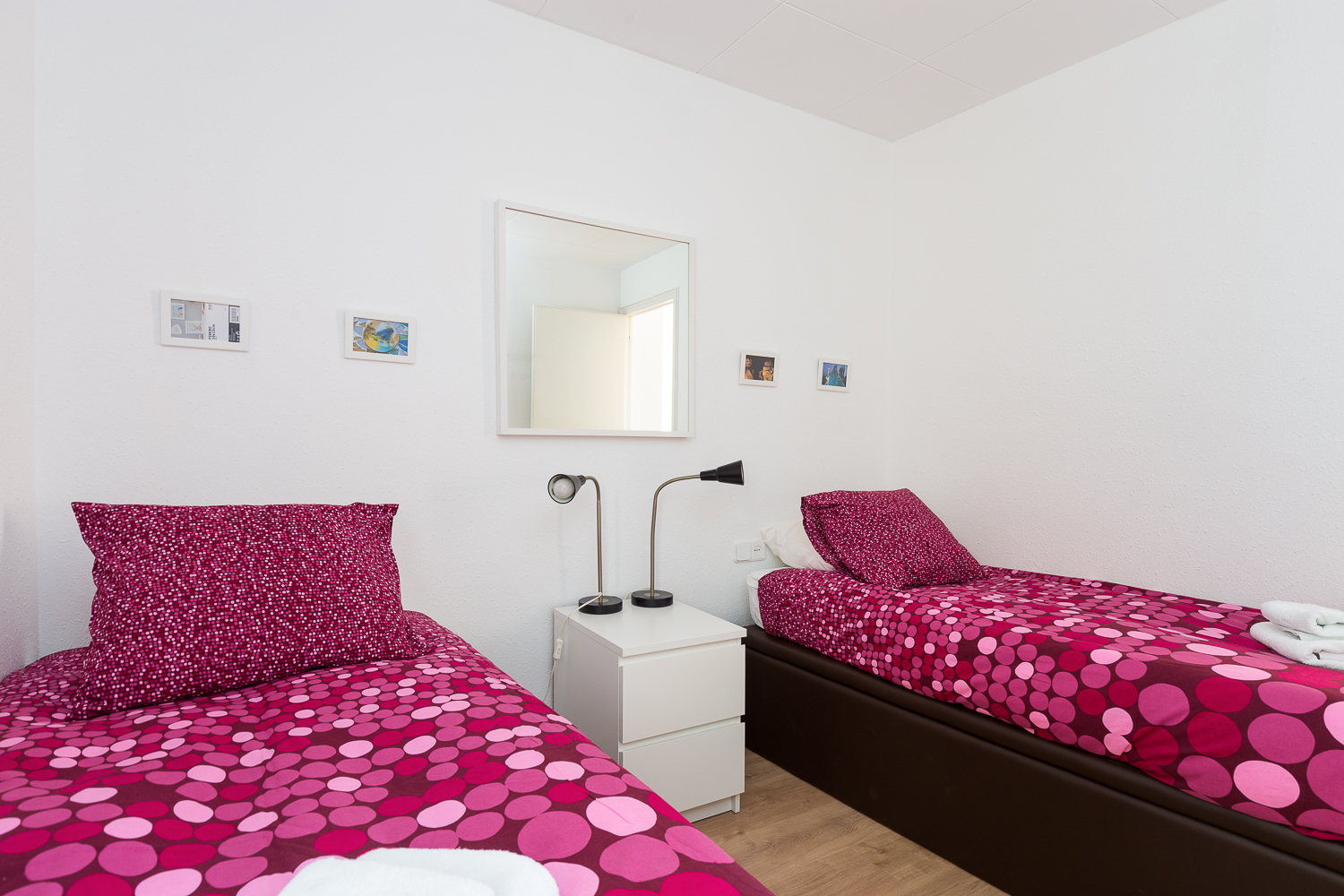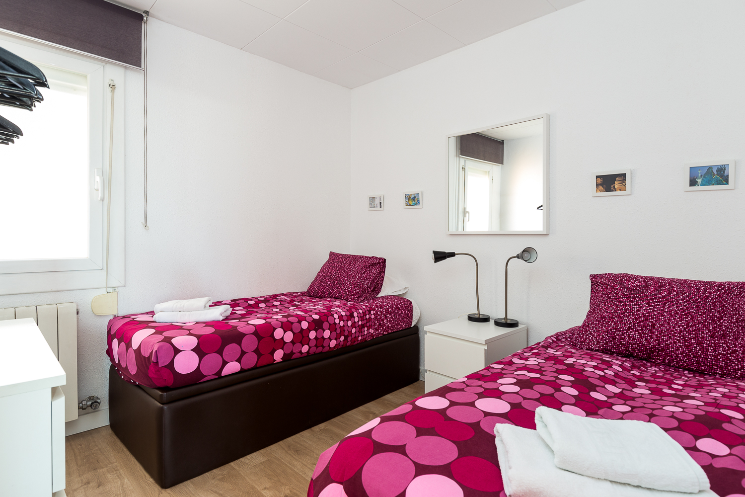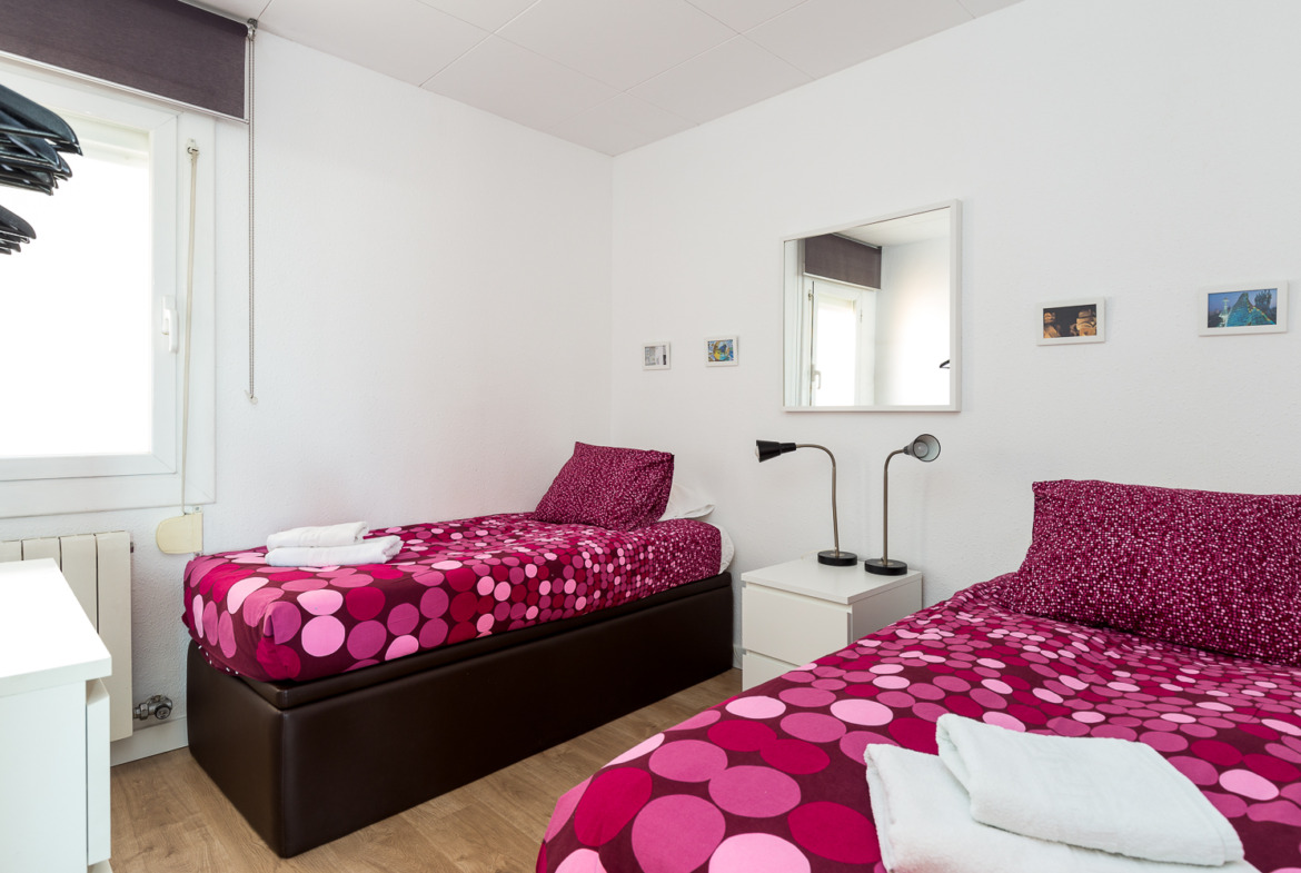 Ático de estilo moderno de 2 habitaciones y máximo 4 personas con terraza privada, soleada y vistas espectaculares a Barcelona, hasta el mar. Familias bienvenidas! Parque para niños delante… Dispone de una habitación doble con cama de matrimonio y otra con 2 camas individuales.